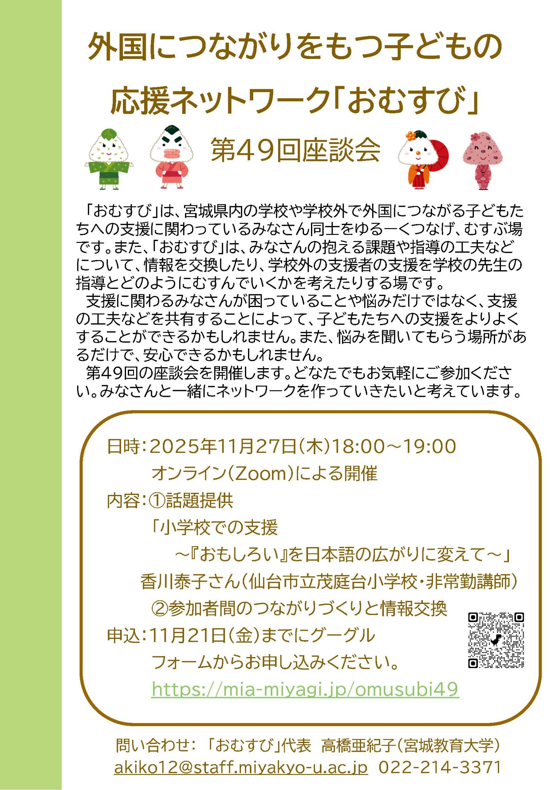 宮城教育大学、外国人の子ども・サポートの会、仙台観光国際協会、そしてわたしたちMIAなどの連携により「外国につながりをもつ子どもの応援ネットワーク『おむすび』」を立ち上げ、月1回程度オンラインで集まる場を設けています。学校の先生、支援団体、大学等、様々な立場の方が集まり、外国ルーツの子どもの学習支援について情報を共有し、つながりを作ることが目的です。次回座談会を以下の内容にて開催します。たくさんの方々と経験や情報を共有し、知恵を出し合い、よりよい支援につながればと願っています。